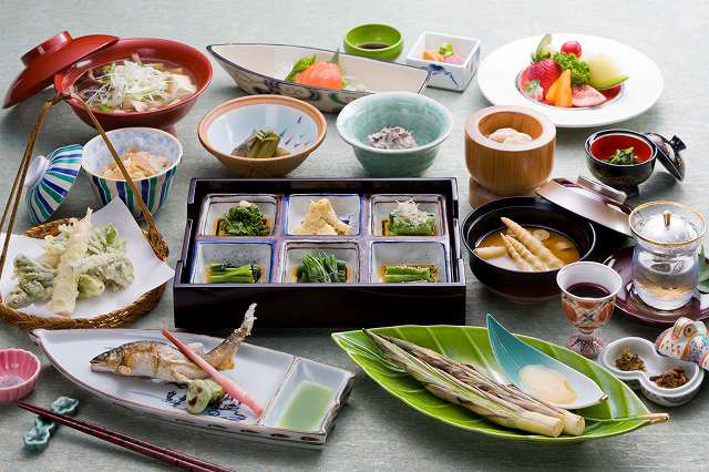 四季折々の山形のおいしい食材(山菜・月山竹・鮎・きのこ・紅花若菜・牛肉・豚肉)を盛り込んだ地採地消の御献立になっております。